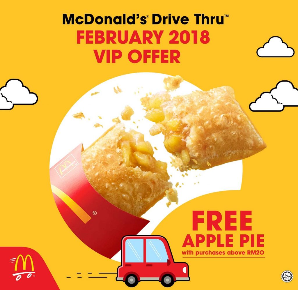 你只需前往附近的McDonald’s Drive Thru,消费满 RM 20,就可获得免费的苹果派啦。
