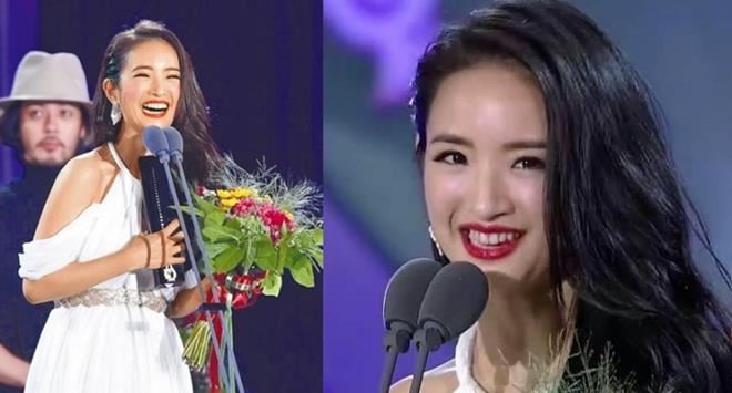 ,一袭薄纱白色礼服,气质逼人,而她领奖时用中、韩、英三国发表感言,还特地用韩文介绍自己「作为台湾的艺人能得到这个奖非常开心,也很感谢。」