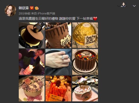 钟欣潼(阿娇)早前认恋台湾「医界王阳明」赖弘国,恋情爆出后,就在自己农历生日当天,阿娇更新微博说自己收到最好的礼物,见她上载好多蛋糕照,但重点当然是她收到钻戒照,阿娇还要戴在无名指,也留言写到:「下一站幸福。」很明显就是阿娇答应男友求婚啦!