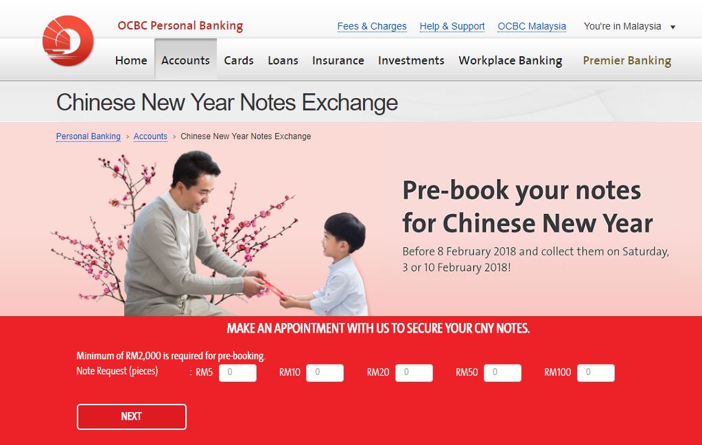 有兴趣的民众可以上网预订新钞票,你可以浏览https://www.ocbc.com.my/personal-banking/accounts/bonus/CNYNotes/index.html 进行预订。不过需要特别注意的是,此次的更换新钞票服务最低必须更换 RM2000。