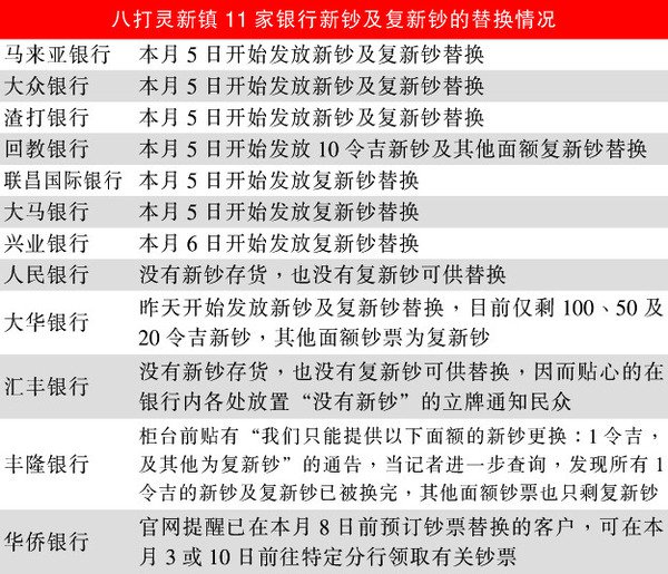 而且每家银行分行的情况不一,相同的银行在某地区的分行可以兑换到新钞票,而在某些分行却无法换到新钞。以下是根据南洋商报记者所调查,八打灵新镇各家银行兑换新钞票的情况:
