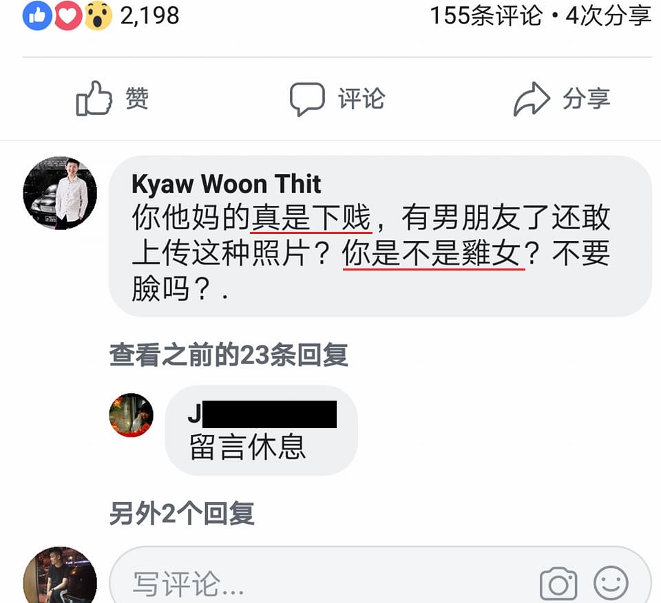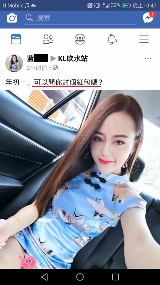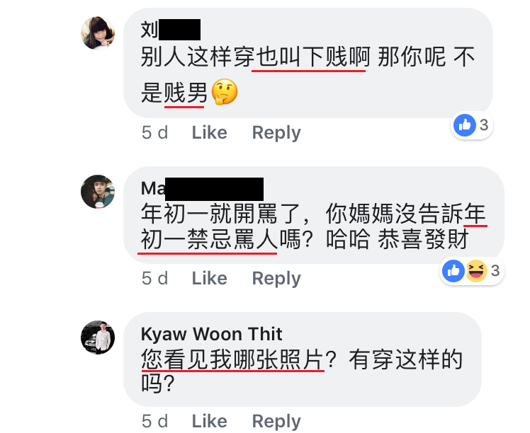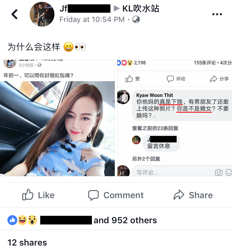 这个农历新年,一位女网友年初一的时候在KL吹水站贴图讨红包。照片中身穿旗袍的她看了没什么问题,但一名男网友(Kyaw) 看了就留言骂她真是下贱还质问她是不是妓女。