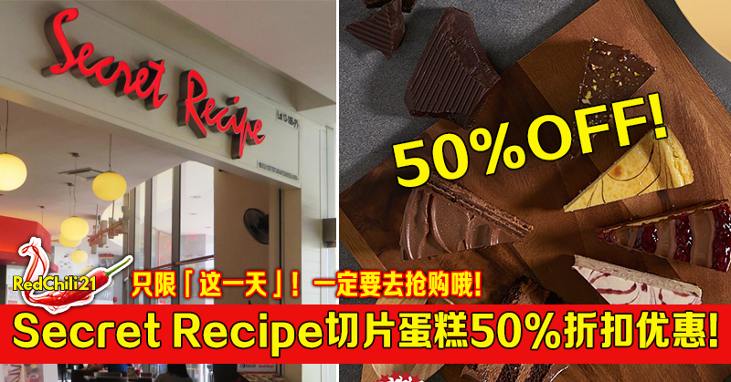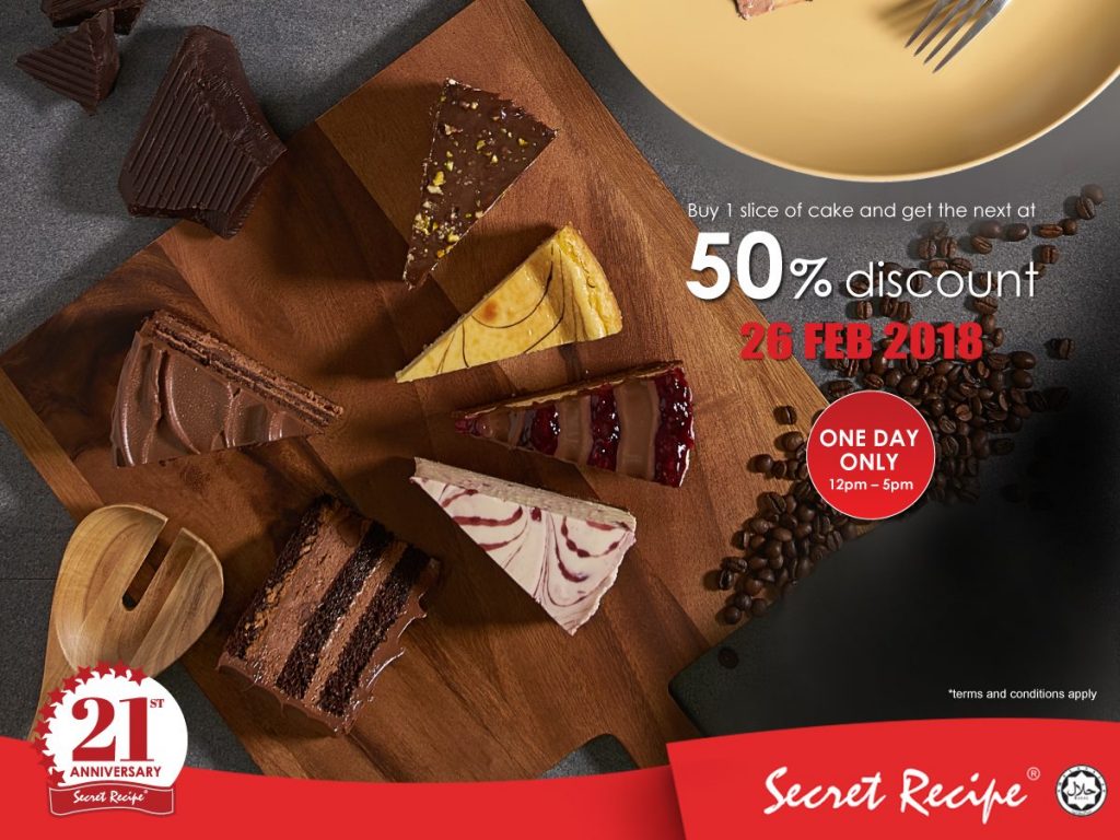 Secret Recipe 将在2月26日推出蛋糕半价优惠。大家可以选择2个切片蛋糕(Slice of Cakes),第一片缴付原价,而第二个切片蛋糕只需缴付半价。