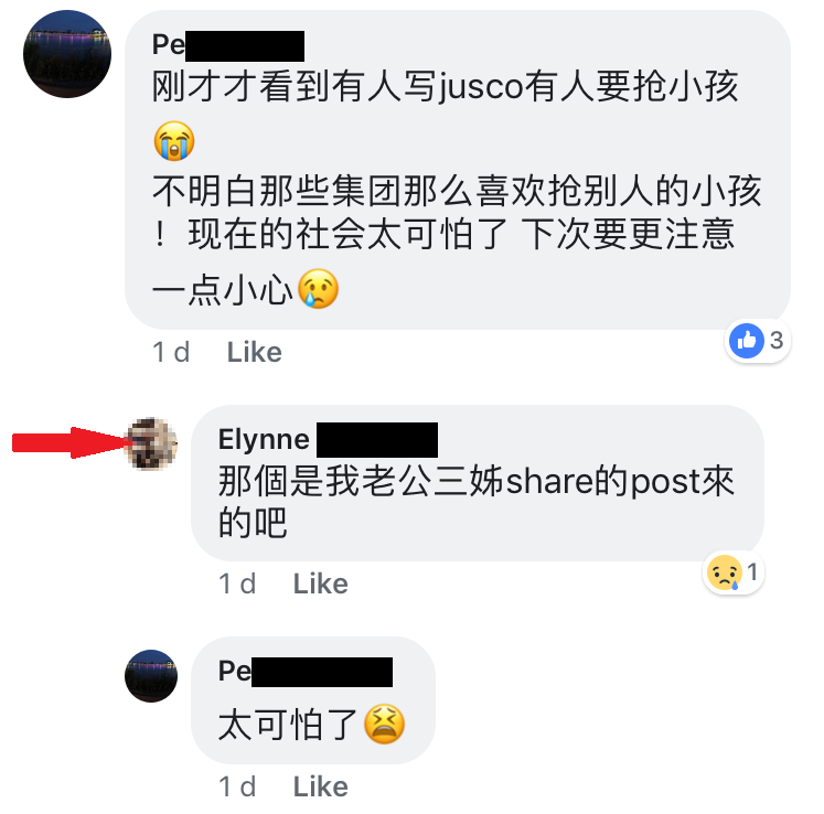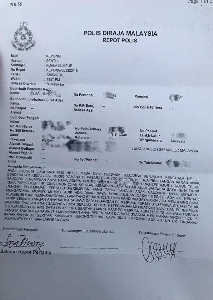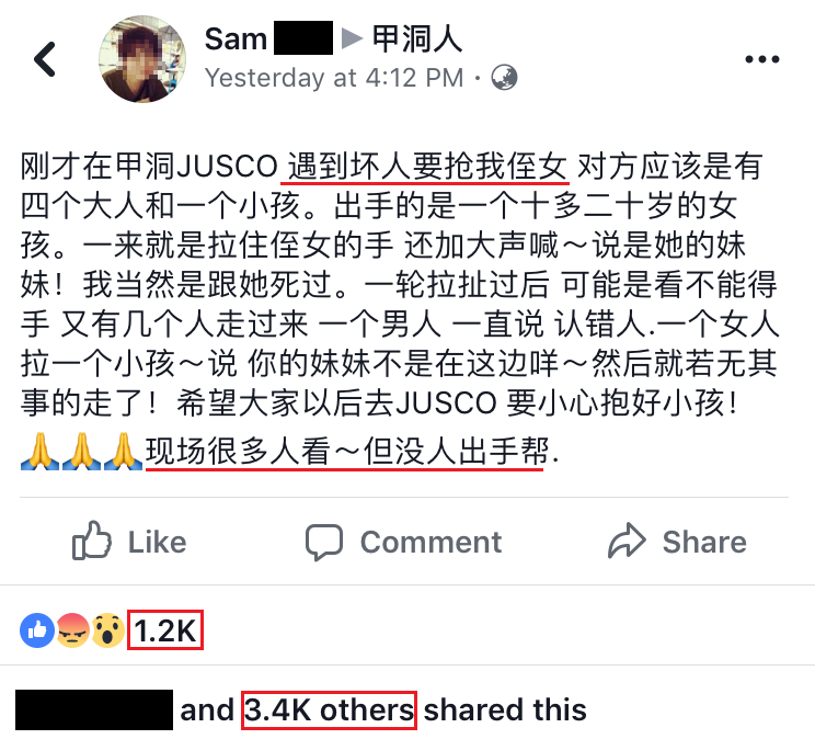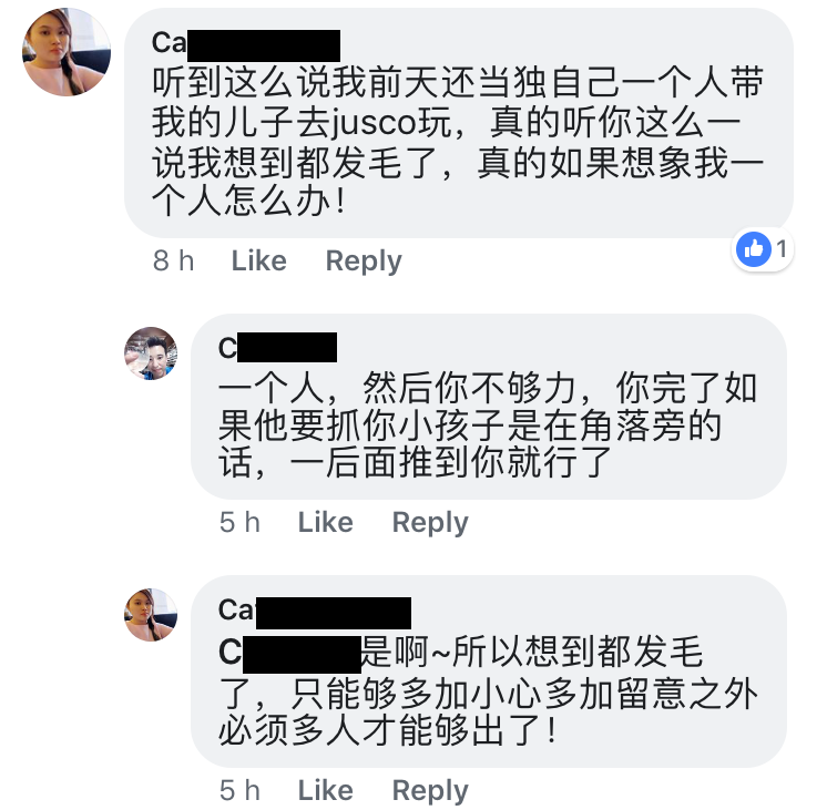 昨日,一位女网友Sam在甲洞人组群分享了这恐怖的经历~那就是她的侄女差点在Jusco Kepong 给人抢去。