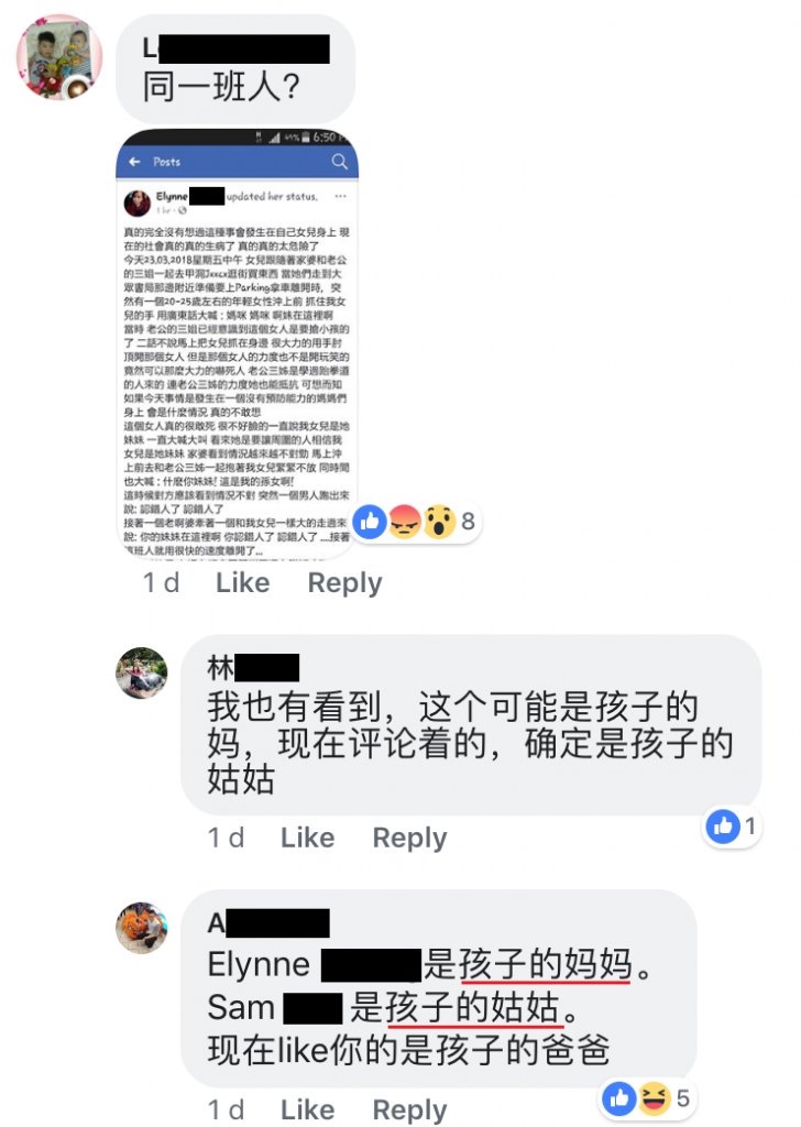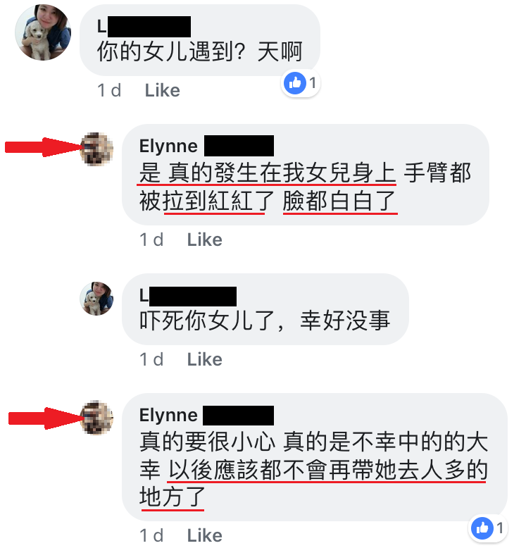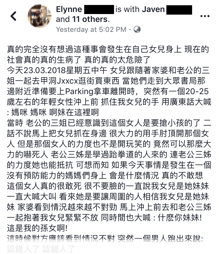 当时 老公的三姐已经意识到这个女人是要抢小孩的了 二话不说马上把女儿抓在身边 很大力的用手肘顶开那个女人 但是那个女人的力度也不是开玩笑的 竟然可以那麽大力的吓死人 老公三姊是学过跆拳道的人来的 连老公三姊的力度她也能抵抗 可想而知 如果今天事情是发生在一个没有预防能力的妈妈们身上 会是什麽情况 真的不敢想。