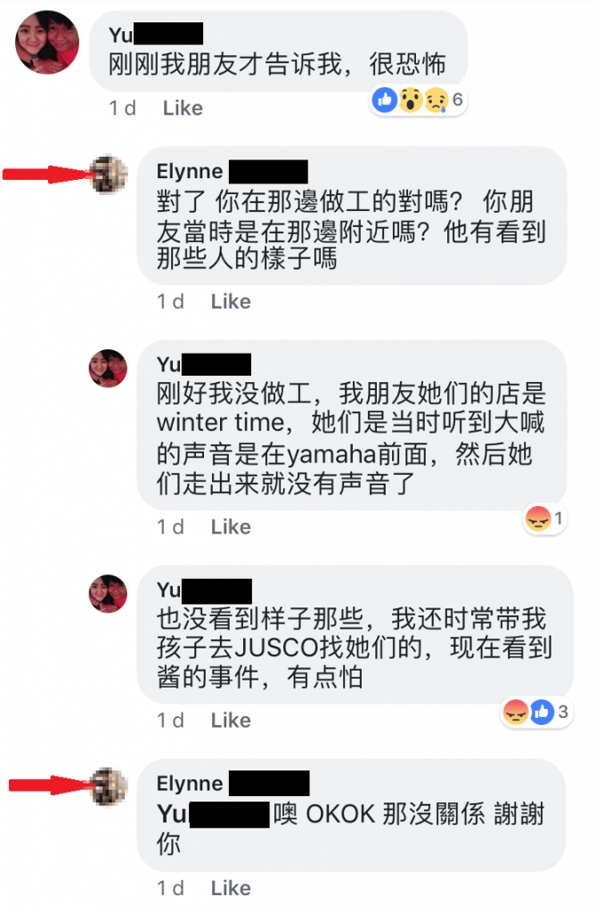 ▼Elynne 也问了一位在Jusco Kepong 做工的朋友有没有看到事发的经过。