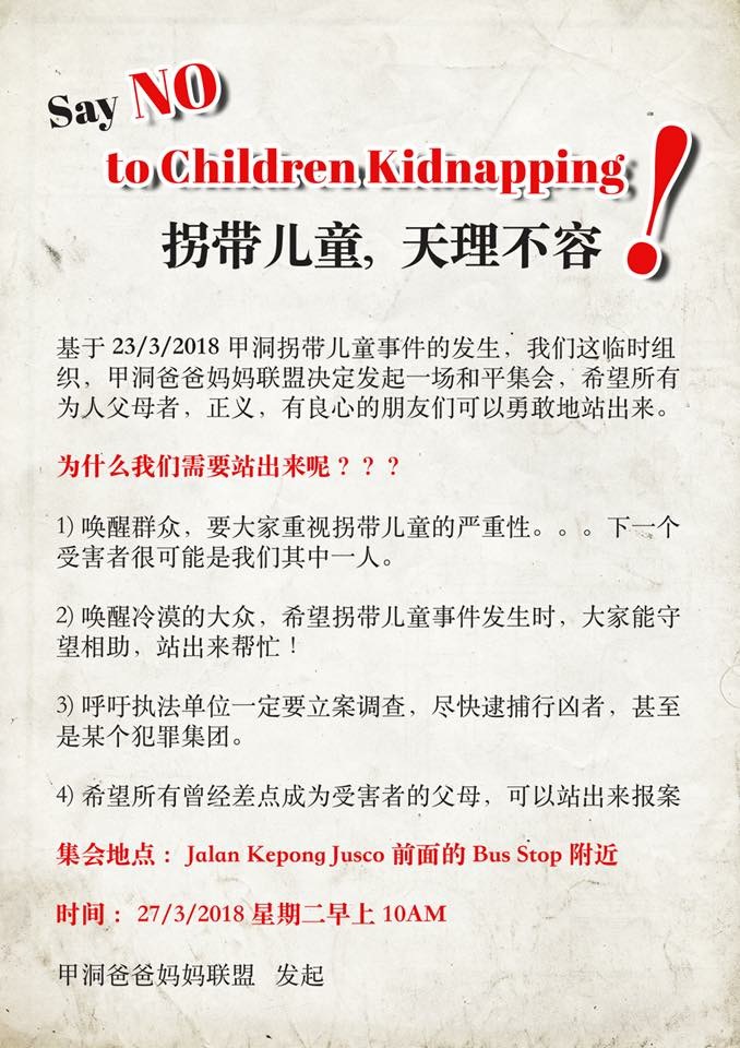 今天23.03.2018星期五中午 女儿跟随着家婆和老公的三姐一起去甲洞Jxxcx逛街买东西 当她们走到大众书局那边附近准备要上Parking拿车离开时,突然有一个20-25岁左右的年轻女性冲上前 抓住我女儿的手 用广东话大喊 : 妈咪 妈咪 啊妹在这裡啊 。