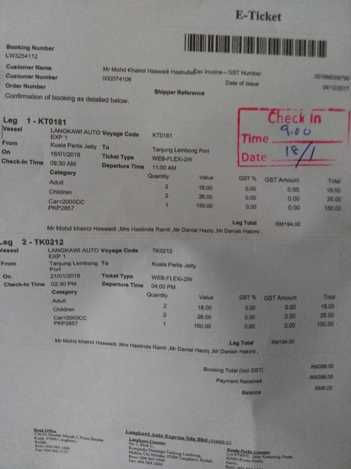 1.6 cc 汽车来回船票 =RM 300.00 (票是网上订购)