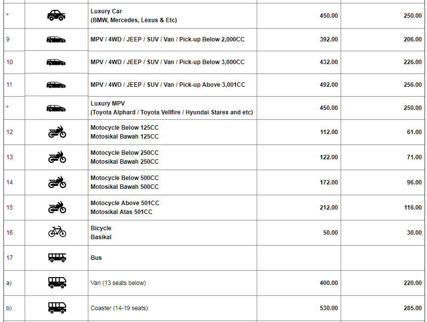 当然汽车的船票也是依据汽车的CC和车款而定,越高CC价钱当然就越高咯~