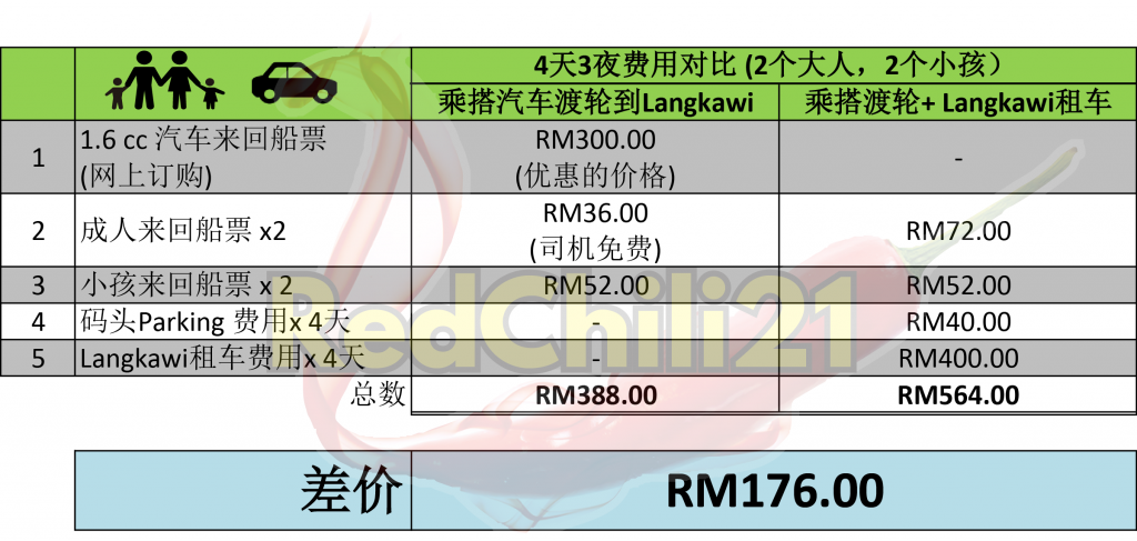 Khairol 指出 Langkawi Auto Express & Langkawi Ro-Ro, 渡轮时间是2小时 (相比载送乘客的渡轮多出45分钟, 也列出了他的费用让网友参考。