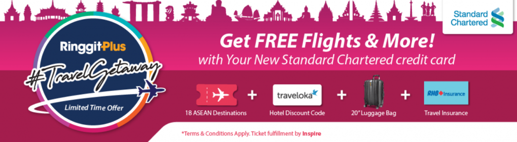 4. Standard Chartered JustOne Platinum MasterCard免费来回机票+酒店折扣礼卷+ 20寸行李箱+ RHB 旅游险。