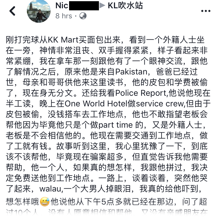 昨晚一位大马好心男子~Nic 在KL吹水站贴出了这个感人的故事,这篇贴文至今已超过了27k人点赞和2千多人的分享。