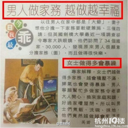 看到没有? 专家研究有没有?!据说科学在选取了近3000名年龄、体质、生活习惯都差不多的男男女女,跟踪9年后发现:男人做家务劳动,尤其是吸尘、擦地板、洗车、搬动家具、搬煤气罐等稍重型的家务,死亡率竟然降低了一半以上!