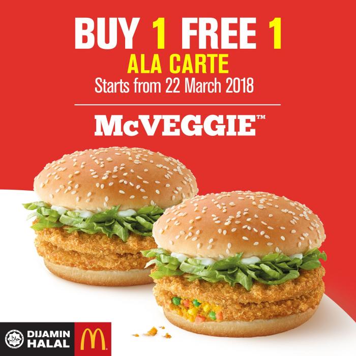麦当劳从3月22日开始推出McVeggie和Double McVeggie Ala Carte买一送一优惠。