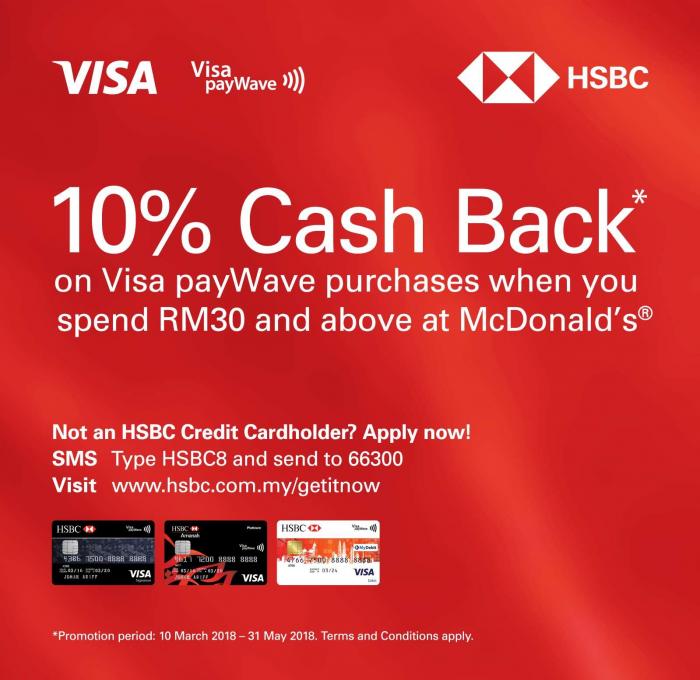 持卡者在麦当劳餐厅消费RM30或以上并使用Visa Paywave方式来付费将会得到10%现金回扣。