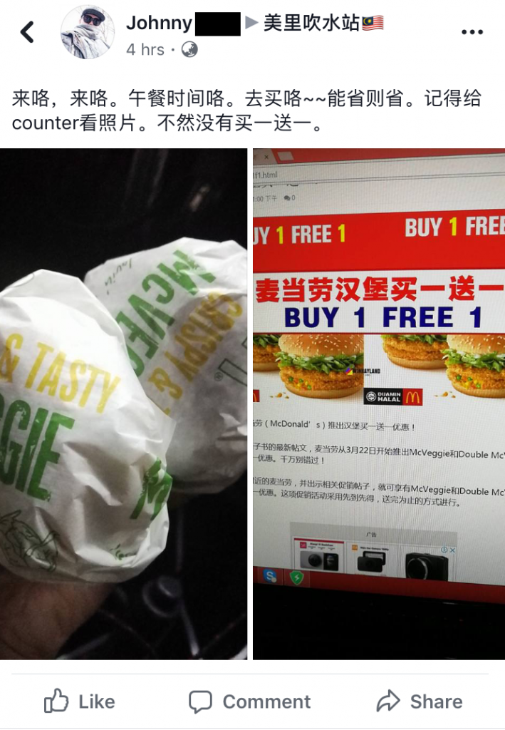 你只需前往你临近的麦当劳餐厅向麦当劳的员工展示此Facebook帖子即可享受优惠。