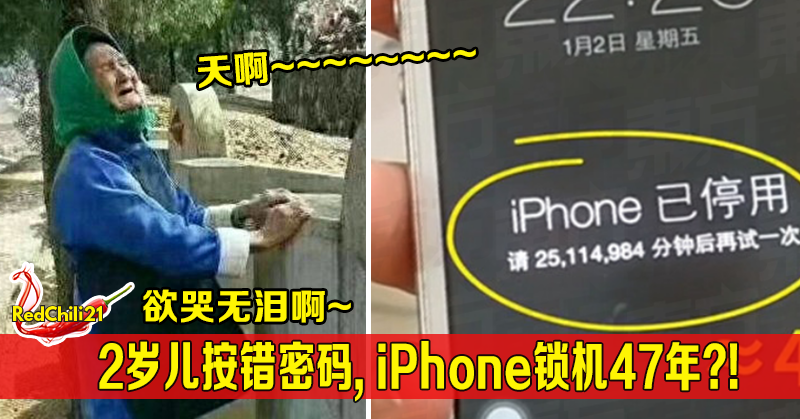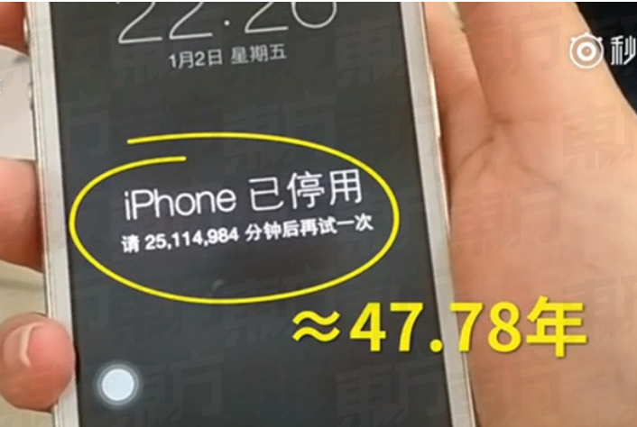 上海一名陆姓女子将iPhone交给2岁儿子玩,因为儿子连续输入错误密码,导致iPhone弹出停用提示,要等到47年后才能再输入密码。