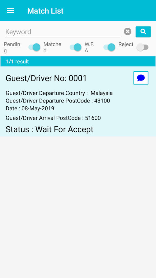 下载后选择要做车手或者跟车,车手写下你的车可以载多少人,输入你的所在的国家(只有马来西亚,新加坡,泰国)和 postcode,还有你家乡(投票的地区)的 postcode,系统就会尽快的配对一个车手或者跟车的兄弟姐妹,之后就可以用chat room确定一些细节(如果要快就直接交换电话用whatsapp/wechat)