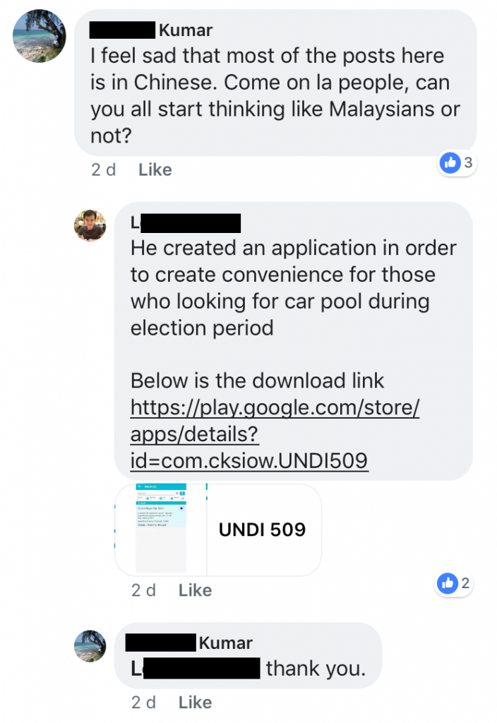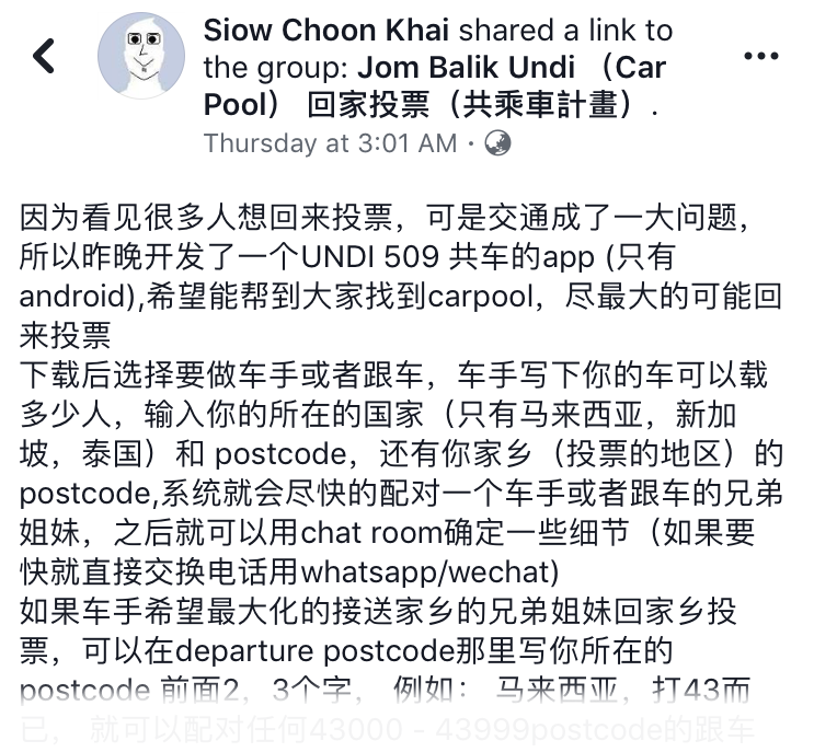 在大选确定落在509后,网上可以看到很多网友在个人脸书还是组群发动了共车回乡投票的活动。