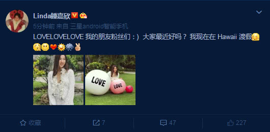 美丽的钟嘉欣来跟网友们互动了,才暂别大家也没几天,也就非常想念了,并写道:”LOVELOVELOVE 我的朋友粉丝们:) 大家最近好吗? 我现在在 Hawaii 渡假”。