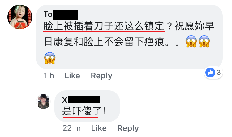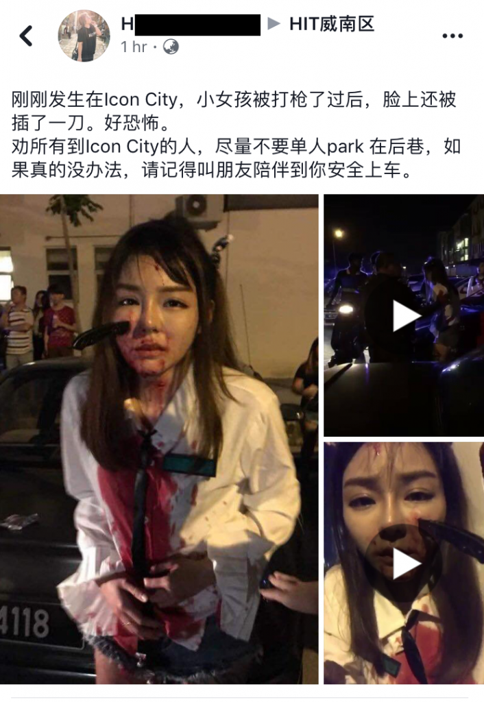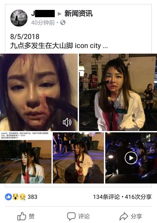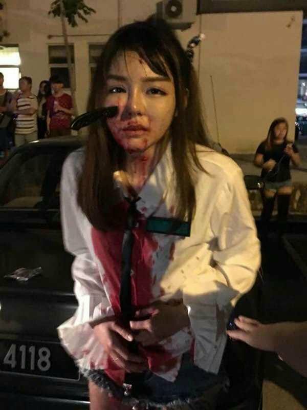 据了解, 这起桉件发生在晚上约9时。根据社交媒体流传的视频显示,一名身穿长袖的白衣女子,右脸部插着一把刀子,完全不见刀身,只见刀柄,伤口鲜血直流,导致白色衬衫一片血染。