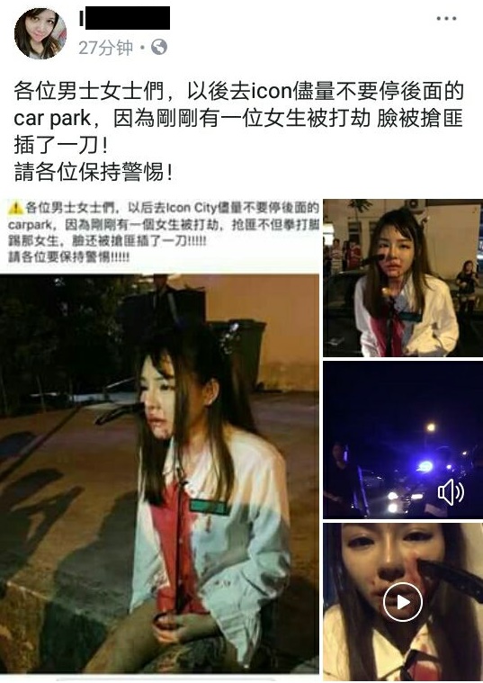 昨晚脸书上流传了这个女生一个人取车遭人抢劫后还被抢匪以刀插脸!