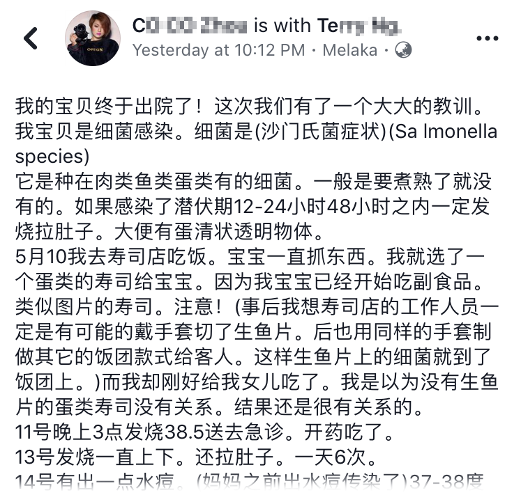 昨日,大马一名妈妈因为带小孩去吃寿司时感染了细菌所以再脸书发文提醒大家。