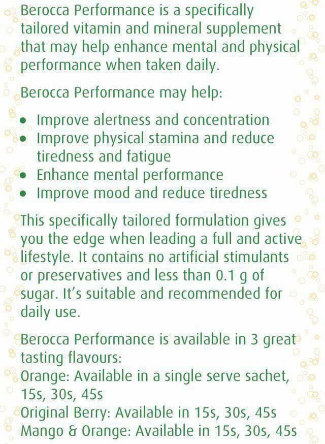 Berocca 是由8种维他命B, 镁,锌,和维他命C组成的。