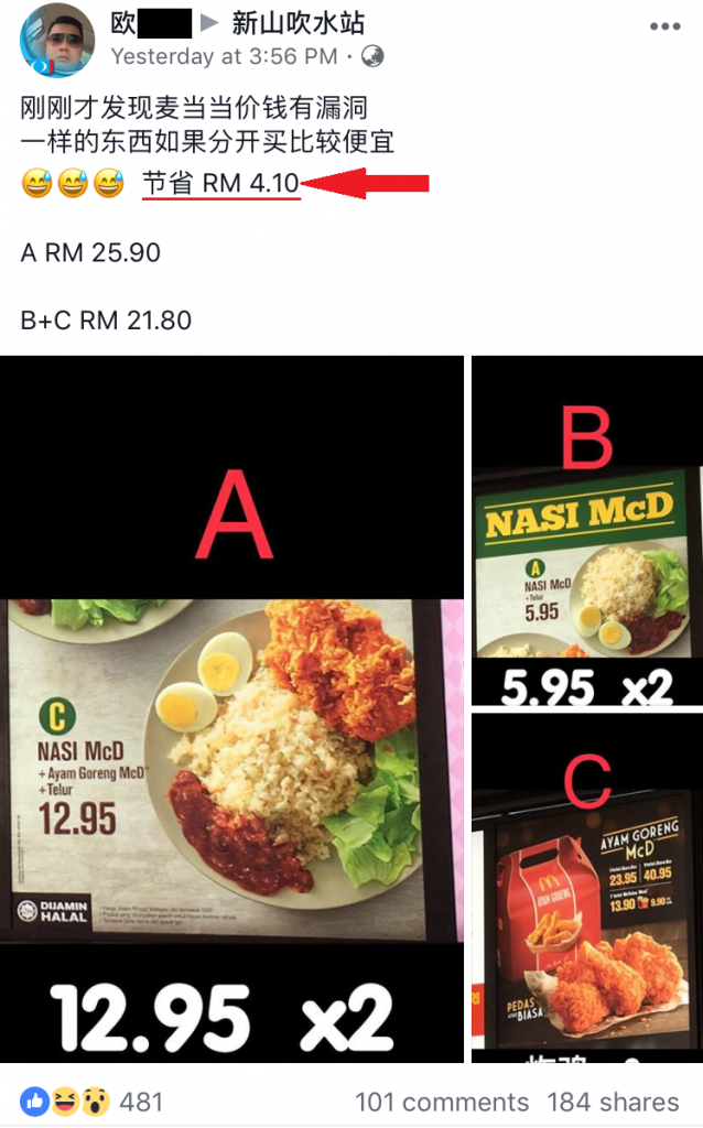 昨日,有位网友在新山吹水站分析了麦当劳套餐和单点的价钱发现了Nasi MCD 分开买会省下RM4.10。