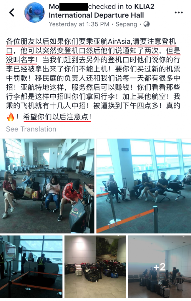 各位朋友以后如果你们要乘亚航AirAsia,请要注意登机口,他可以突然变登机口然后他们说通知了两次,但是没叫名字!当我们赶到去另外的登机口时他们说你的行李已经被拿出来了你们不能上机!要你们买过新的机票中罚款!移民庭的负责人还和我们说每一天都有很多中招!亚航特地这样,服务然后可以赚钱!你们看看那些行李都是这样中招叫你们拿回行李!加上其他航空!我乘的飞机就有十几人中招!被逼换到下午四点多!真的!希望你们以后注意点!