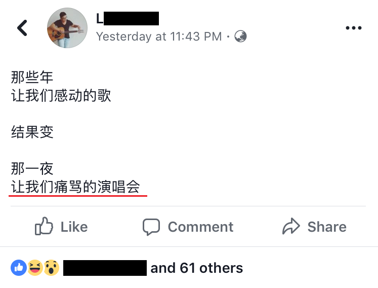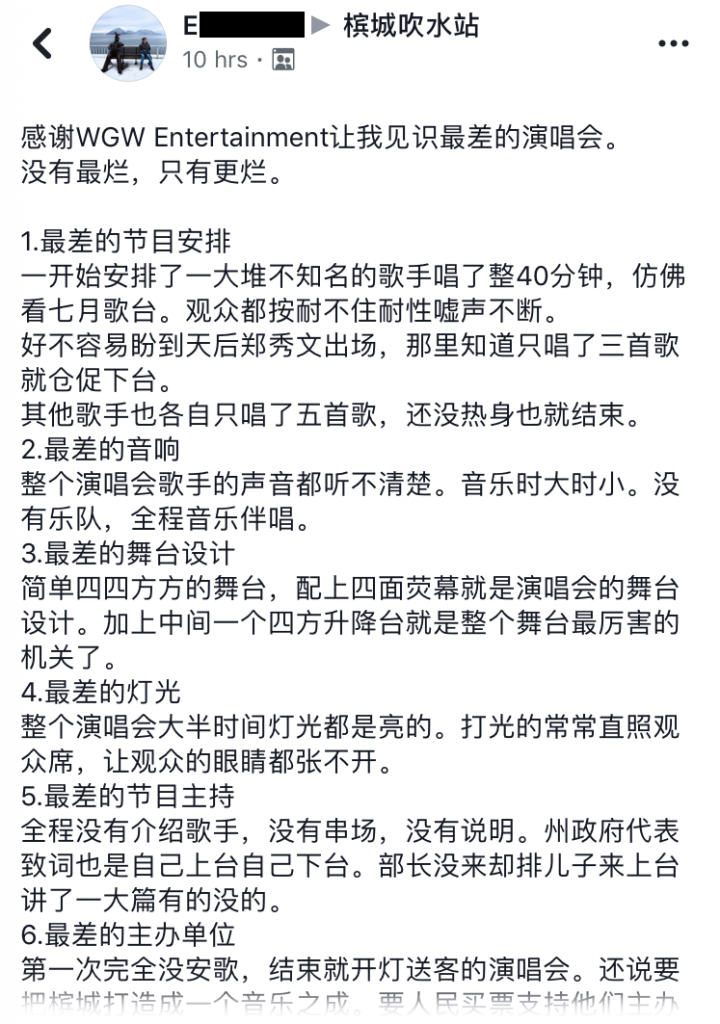 第一次完全没安歌,结束就开灯送客的演唱会。还说要把槟城打造成一个音乐之成。要人民买票支持他们主办的演唱会。
