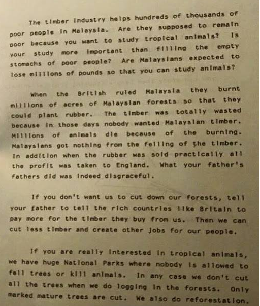 如果你不希望我们砍伐我们的森林,那就告诉你爸爸,叫他去跟那些富有的国家说,包括英国在内,付更多的钱来买我们的木材。那么我们就少砍点树,转而创造其他的工作机会给我们的人民。