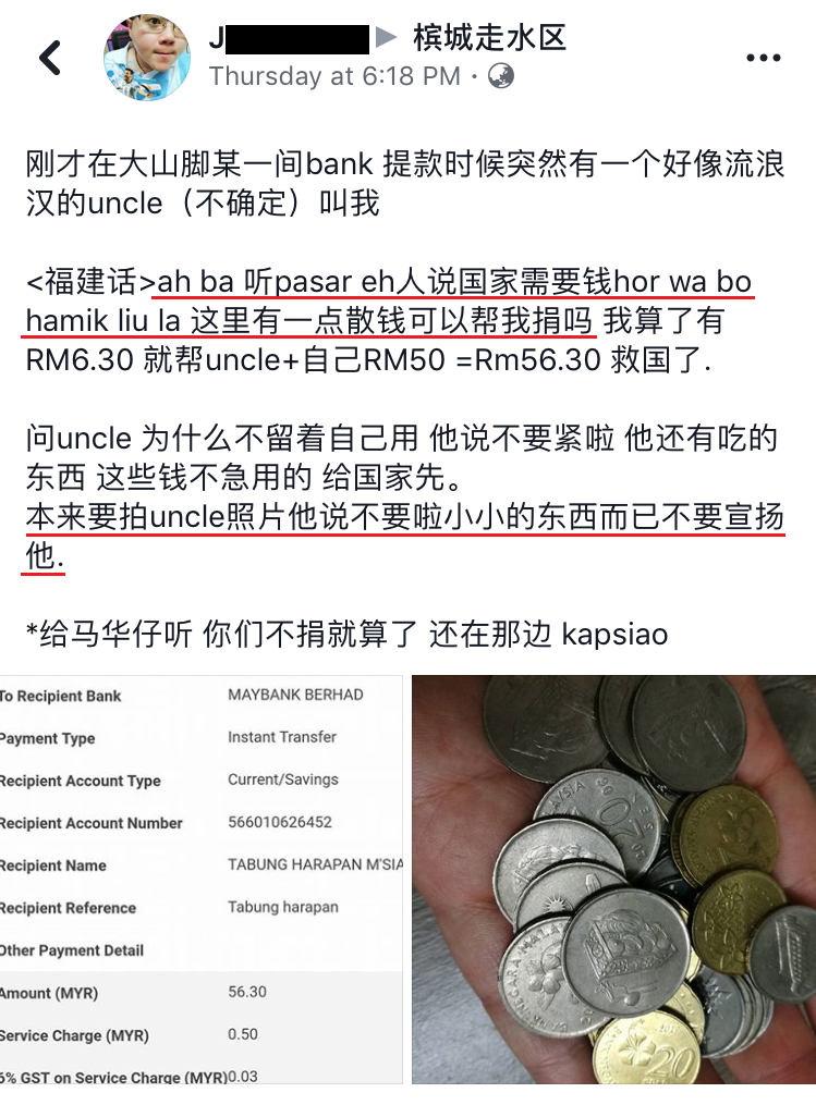 上周三,槟城有位网友在网上发文指出他在大山脚银行提款的时候突然有一位流浪汉把身上僅有的全副身家(RM6.30)拜托了他捐款给国家。很多网友看了此贴后,都表示好感功。