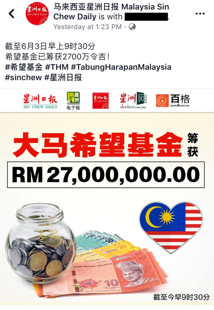 ▼截至6月3日早上9时30分,希望基金已筹获2700万令吉!