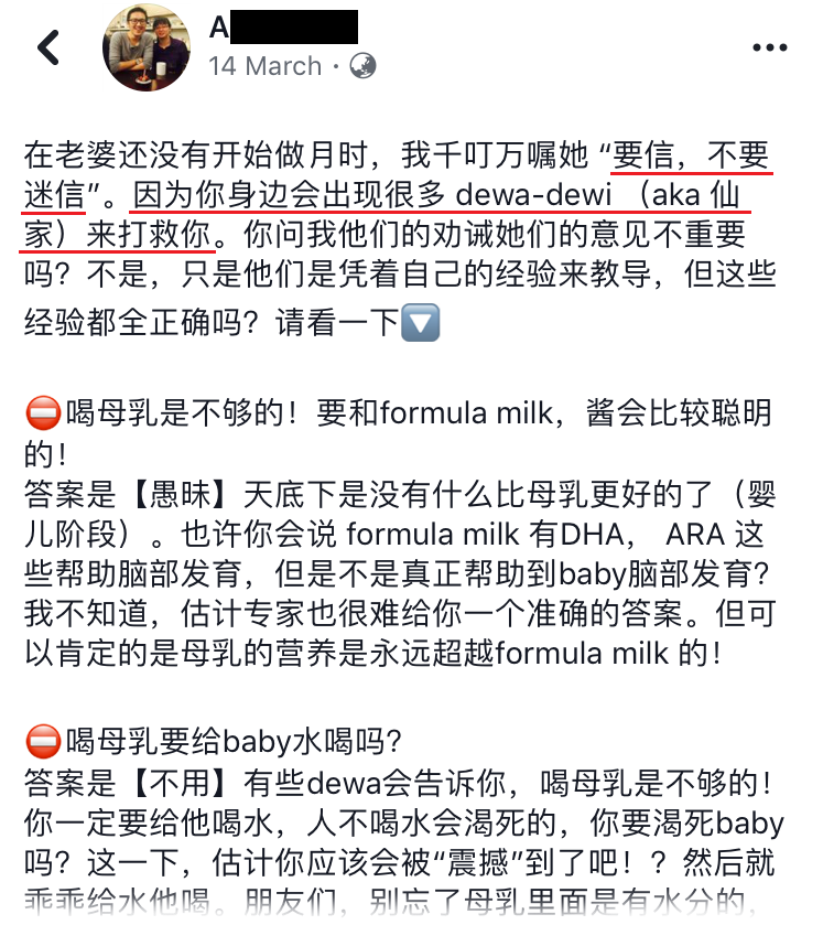 在老婆还没有开始做月时,我千叮万嘱她 “要信,不要迷信”。因为你身边会出现很多 dewa-dewi (aka 仙家)来打救你。你问我他们的劝诫她们的意见不重要吗?不是,只是他们是凭着自己的经验来教导,但这些经验都全正确吗?请看一下