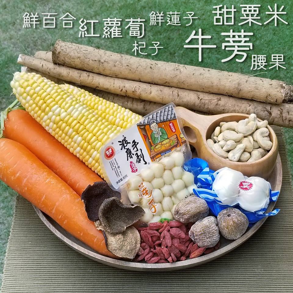 新鲜牛蒡、甜粟米、红萝卜、鲜百合、鲜莲子、腰果、杞子配蜜枣、果皮、冰糖