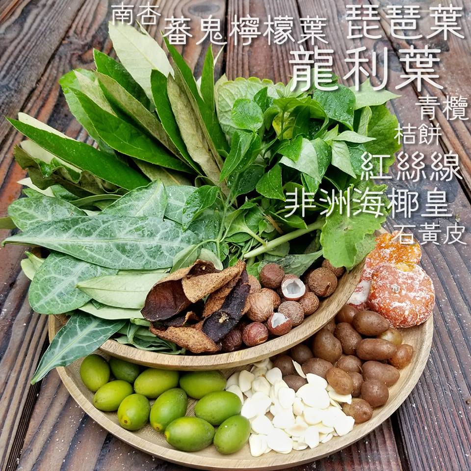 非洲海椰皇、龙脷叶、琵琶叶、红丝线、蕃鬼柠檬叶、石黄皮、青榄、桔饼、南杏配果皮
