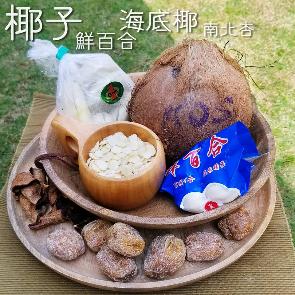 椰子(连椰子水)、泰国海底椰、鲜百合、南北杏配蜜枣、果皮
