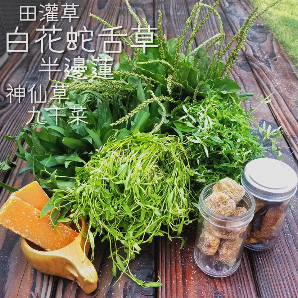 白花蛇舌草、半边莲、田灌草、神仙草、九干菜配蜜枣、果皮、片糖