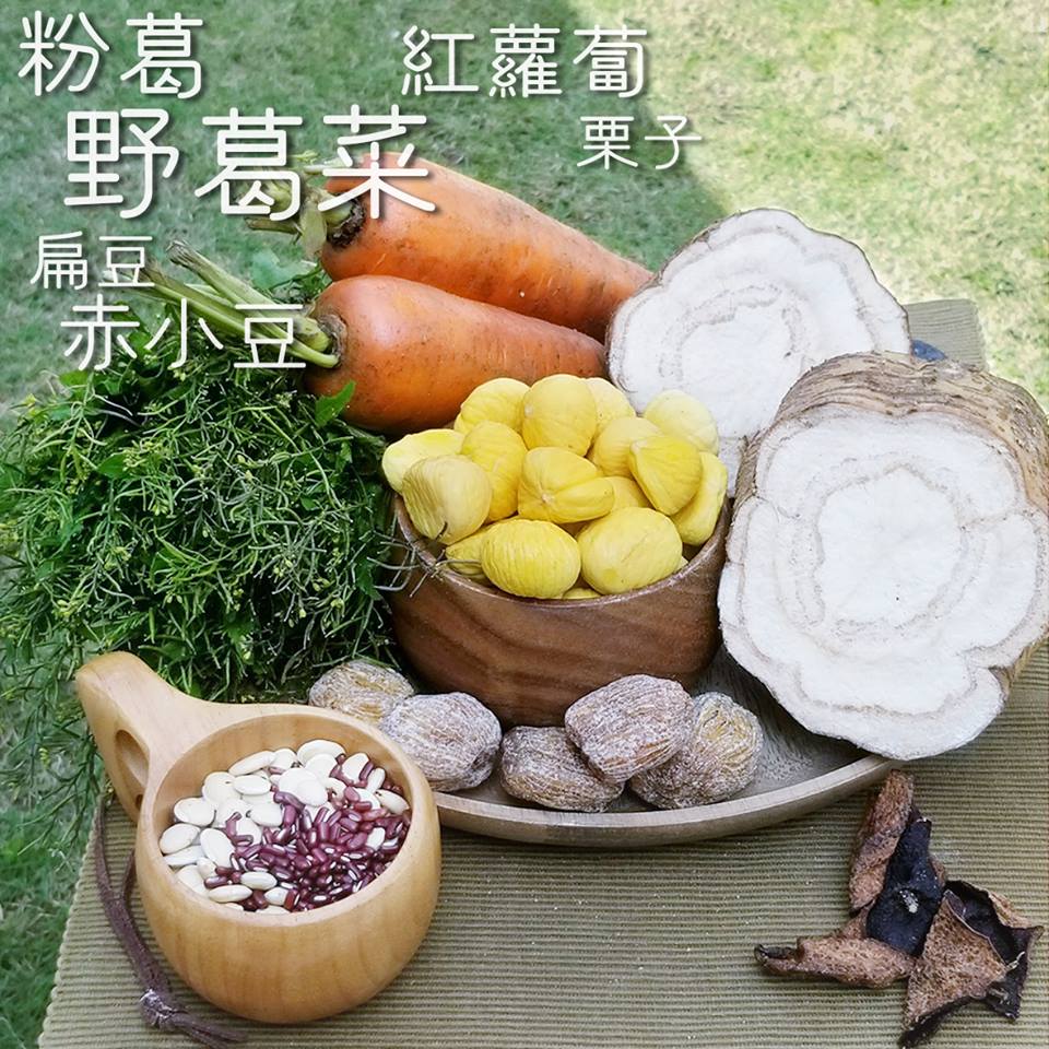 野葛菜、粉葛、红萝卜、栗子、赤小豆、扁豆配蜜枣、果皮