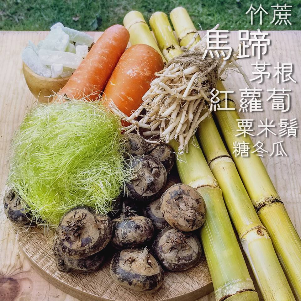 竹蔗、马蹄、茅根、粟米鬚、红萝卜、糖冬瓜