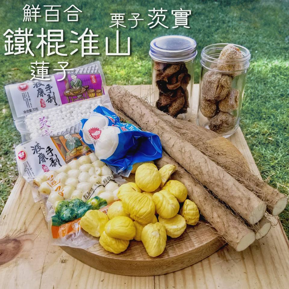 铁棍淮山、鲜莲子、鲜茨实、鲜百合、栗子配蜜枣、果皮