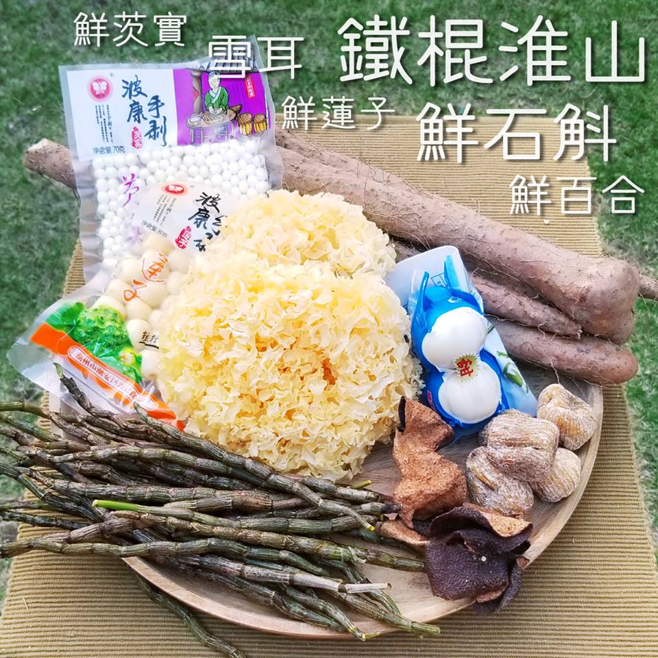 铁棍淮山、鲜石斛、鲜百合、鲜莲子、鲜茨实、雪耳配蜜枣、果皮、冰糖