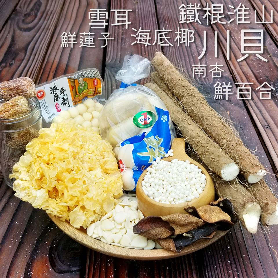 川贝、铁棍淮山、鲜百合、泰国海底椰、鲜莲子、雪耳、南杏配蜜枣、果皮