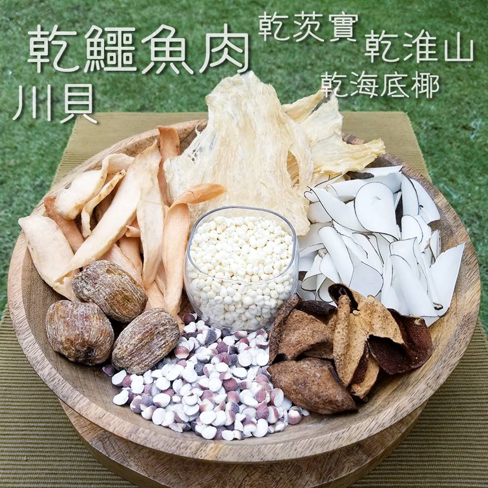 干鳄鱼肉、川贝、乾海底椰、乾淮山、乾茨实配蜜枣、果皮