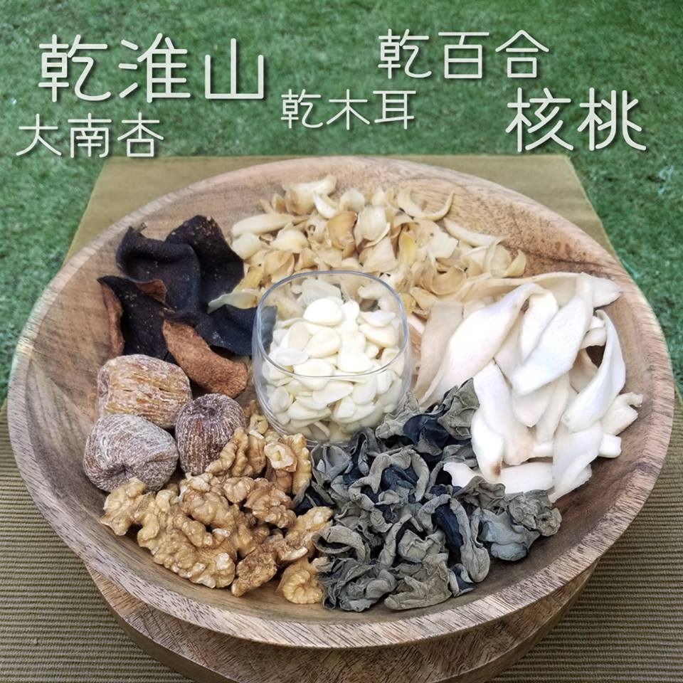 干淮山、干百合、干木耳、核桃、大南杏配蜜枣、果皮