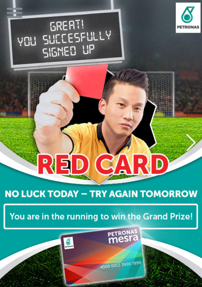 Losers from the daily game are eligible to enter the lucky draw for chance to win grand prize. Eligible winners will need to answer a simple question before they can redeem the grand prize. Grand prize of the Adidas voucher and Mesra points draw will take place on 1st August 2018 & winners will be announced on 15th August 2018 and be published on the Mymesra website at arenabolapetronas.mymesra.com.my
