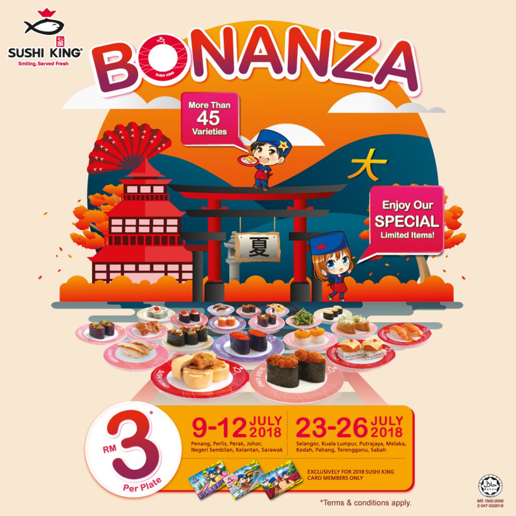 Sushi King 分两个阶段在全马举行 Sushi King Bonanza。在Sushi King Bonanza 中,将有多达45样的Sushi 可选择。每碟寿司只需 RM 3哦!