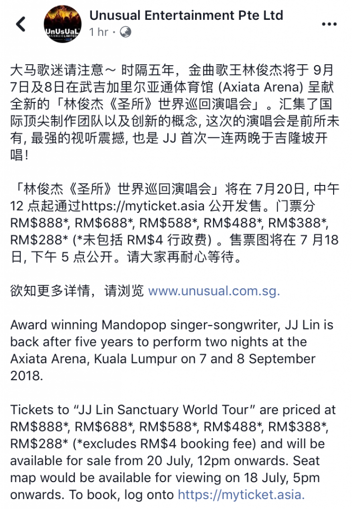 飞凡娱乐(UnUsUaL Entertainment)今天(16日)通过Facebook公布售票资讯。林俊杰将在9月7日和9月8日,一连两晚在Axiata Arena室内体育馆开唱。