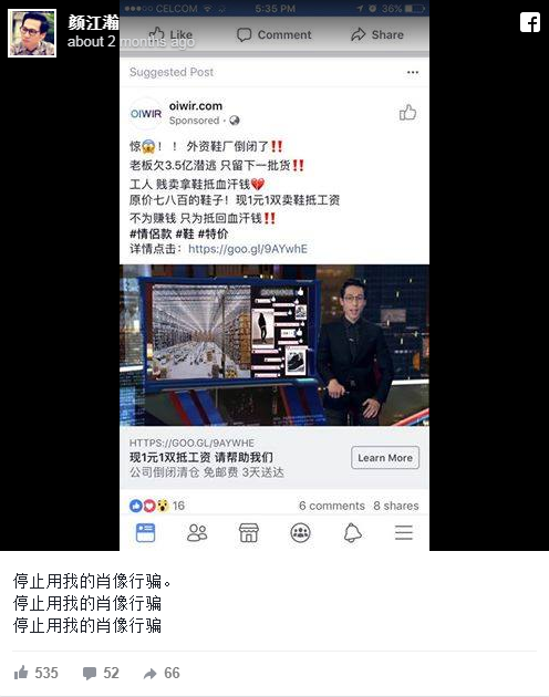 2. 如果看到卖家post很多新闻贴,强调很多新闻播报员报导过该产品,你得去查询。因为AEC主播颜江瀚才发帖说有人利用了他的新闻肖像。